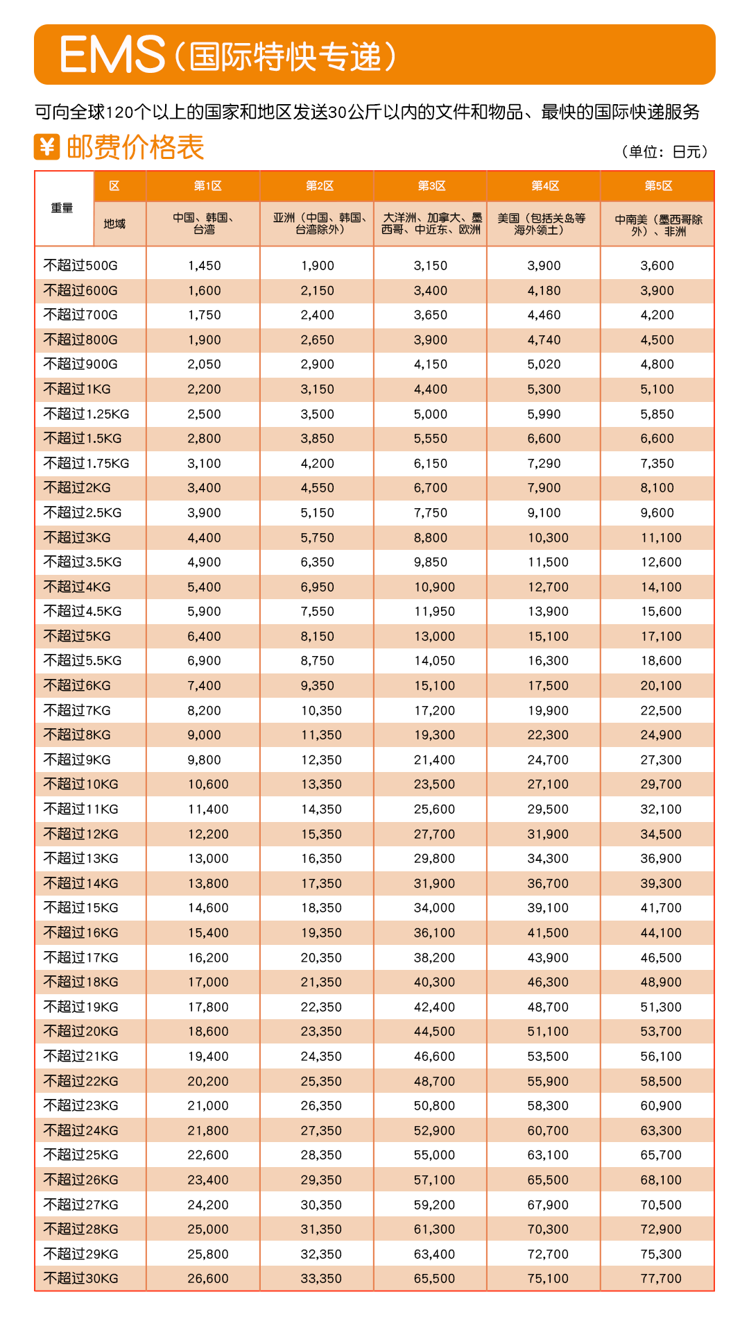 日本寄中国EMS邮费